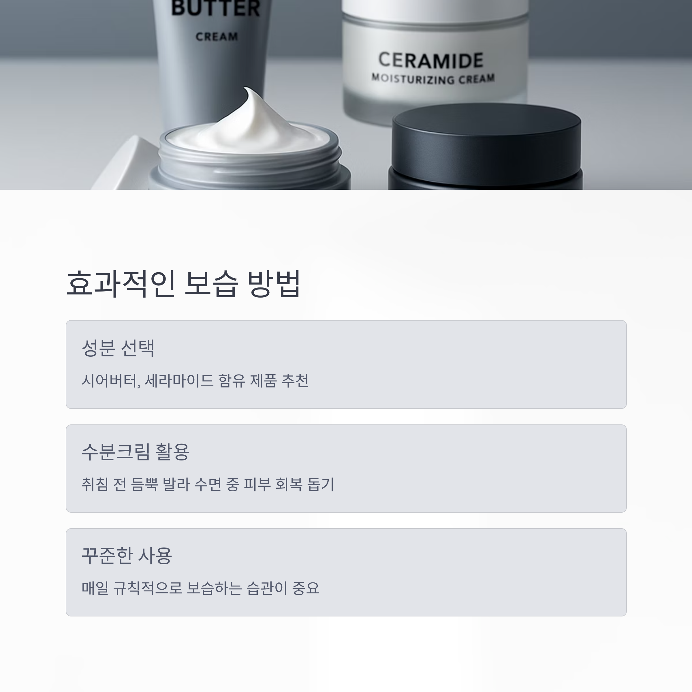 아침 저녁 두 번만 해도 충분해요. 세안 후에는 피부에 자극이 적은 순한 성분의 보습제를 꼼꼼하게 발라주세요. 저는 시어버터나 세라마이드 성분이 함유된 제품을 사용하는데, 피부에 흡수가 잘 되면서 촉촉함이 오래 지속돼서 좋아요. 그리고 잠자기 전에 수분크림을 듬뿍 바르고 자면 아침에 피부가 한결 편안한걸 느낄 수 있어요.
