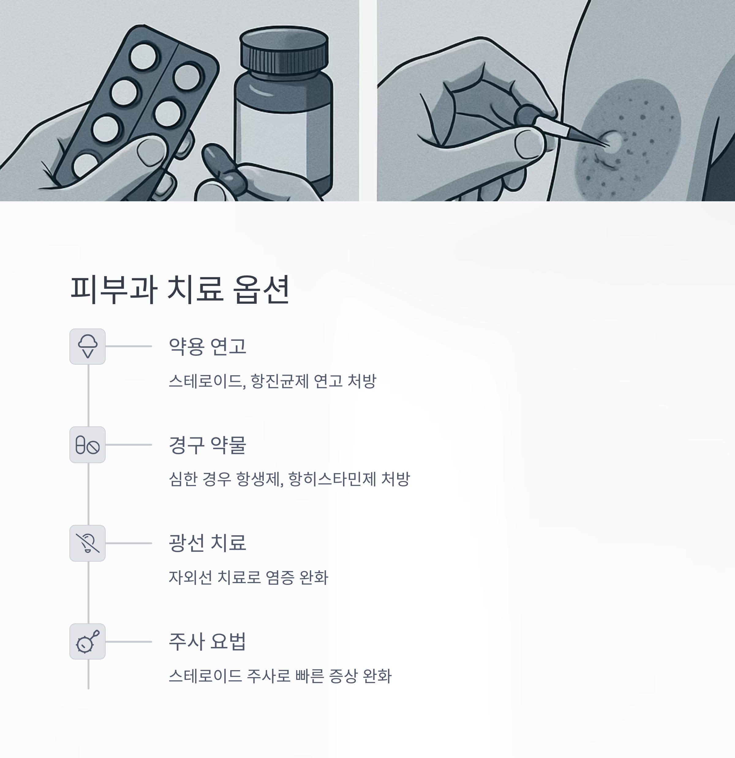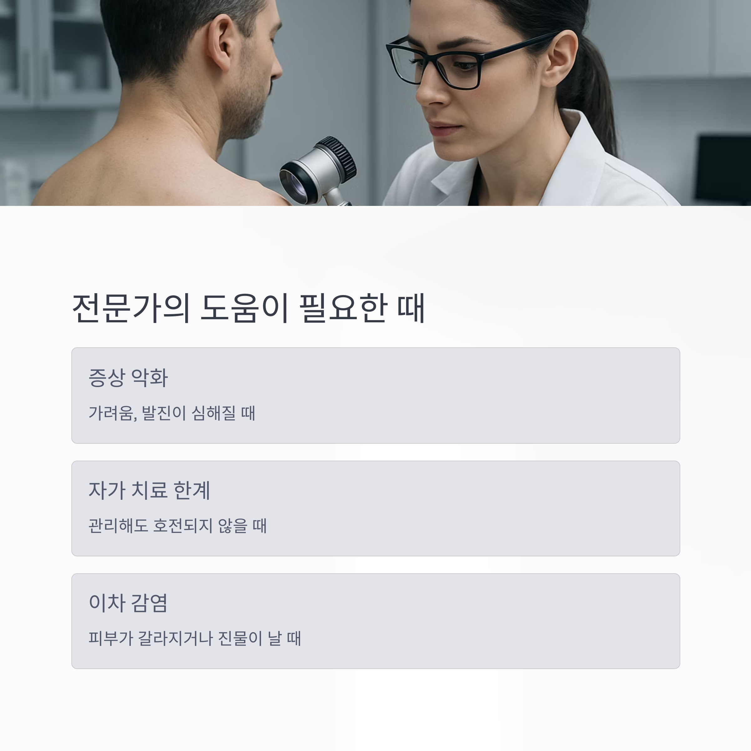 지루성 피부염이 심하거나 자가 치료로 호전되지 않는 경우에는 반드시 피부과 전문의의 도움을 받아야 해요. 피부과에서는 증상의 정도와 피부 상태에 따라 다양한 치료법을 제시해 줄 거예요. 스테로이드 연고나 항진균제 연고를 처방받을 수도 있고, 필요에 따라서는 광선 치료나 다른 치료법을 병행할 수도 있어요.