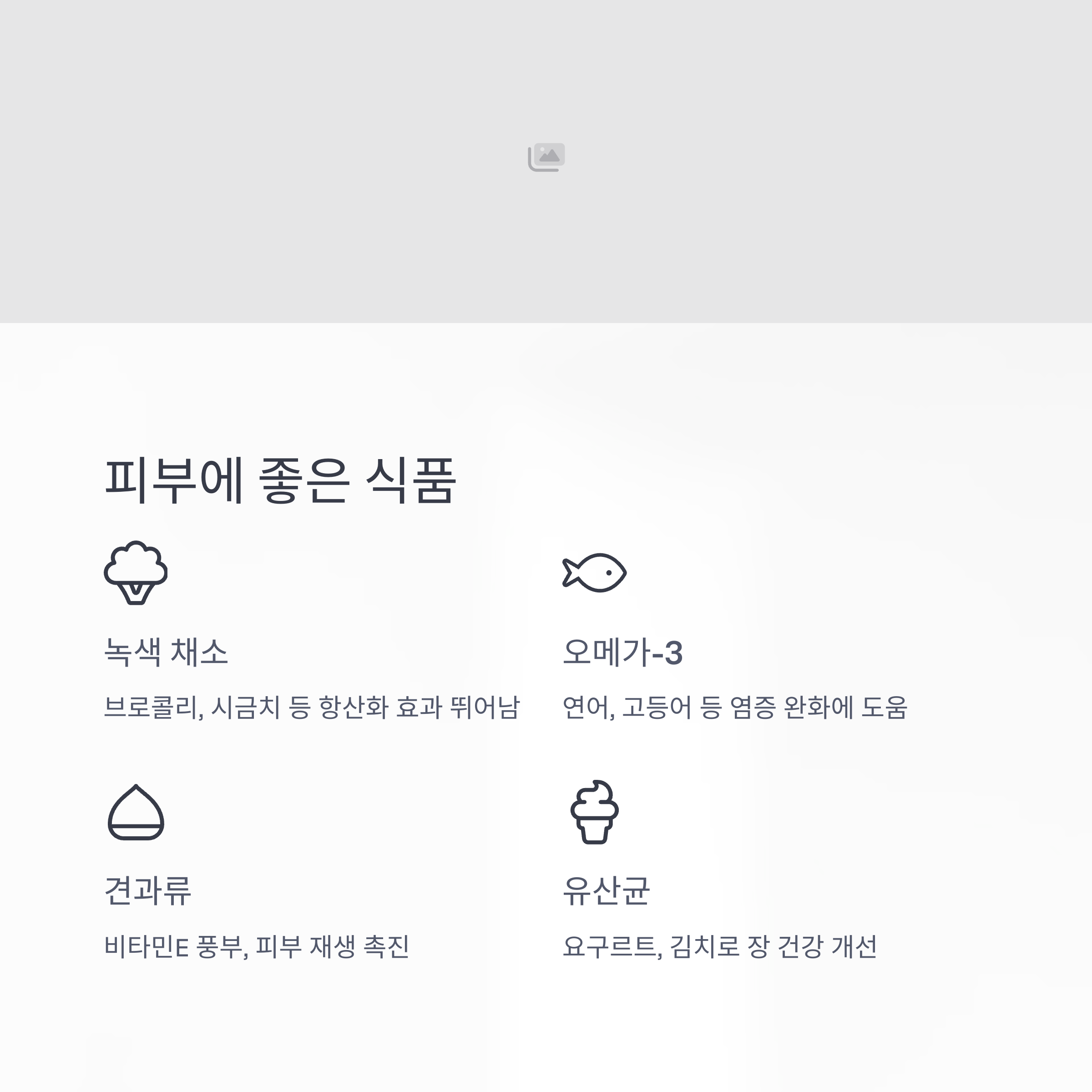 그리고 오메가-3 지방산이 풍부한 생선이나 견과류도 꾸준히 섭취하고 있답니다. 또, 장 건강에도 신경 쓰고 있는데, 장 건강이 피부 건강과 밀접한 관련이 있다고 하더라고요. 유산균이 풍부한 요구르트나 김치를 챙겨 먹고 있어요.