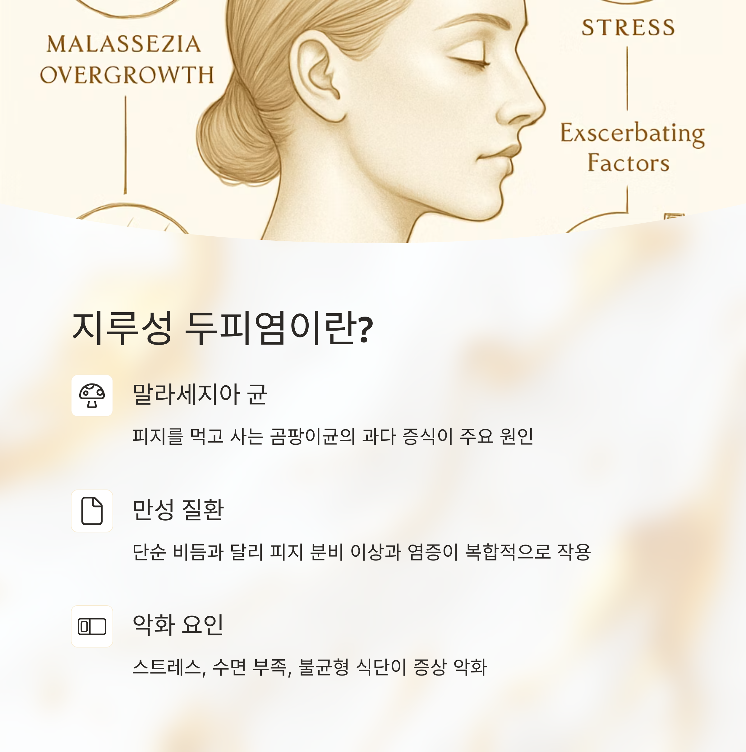 두피가 간지럽고 하얀 각질이 떨어지는 증상, 혹시 지루성 두피염은 아닐까 걱정되시죠? 지루성 두피염은 단순한 비듬과 달리 피지 분비 이상과 염증이 복합적으로 작용하는 만성 질환이에요. 말라세지아 균이라는 곰팡이균의 과다 증식이 주요 원인인데, 이 균은 피지를 먹고 살기 때문에 피지 분비가 많을수록 더 활개를 칩니다.