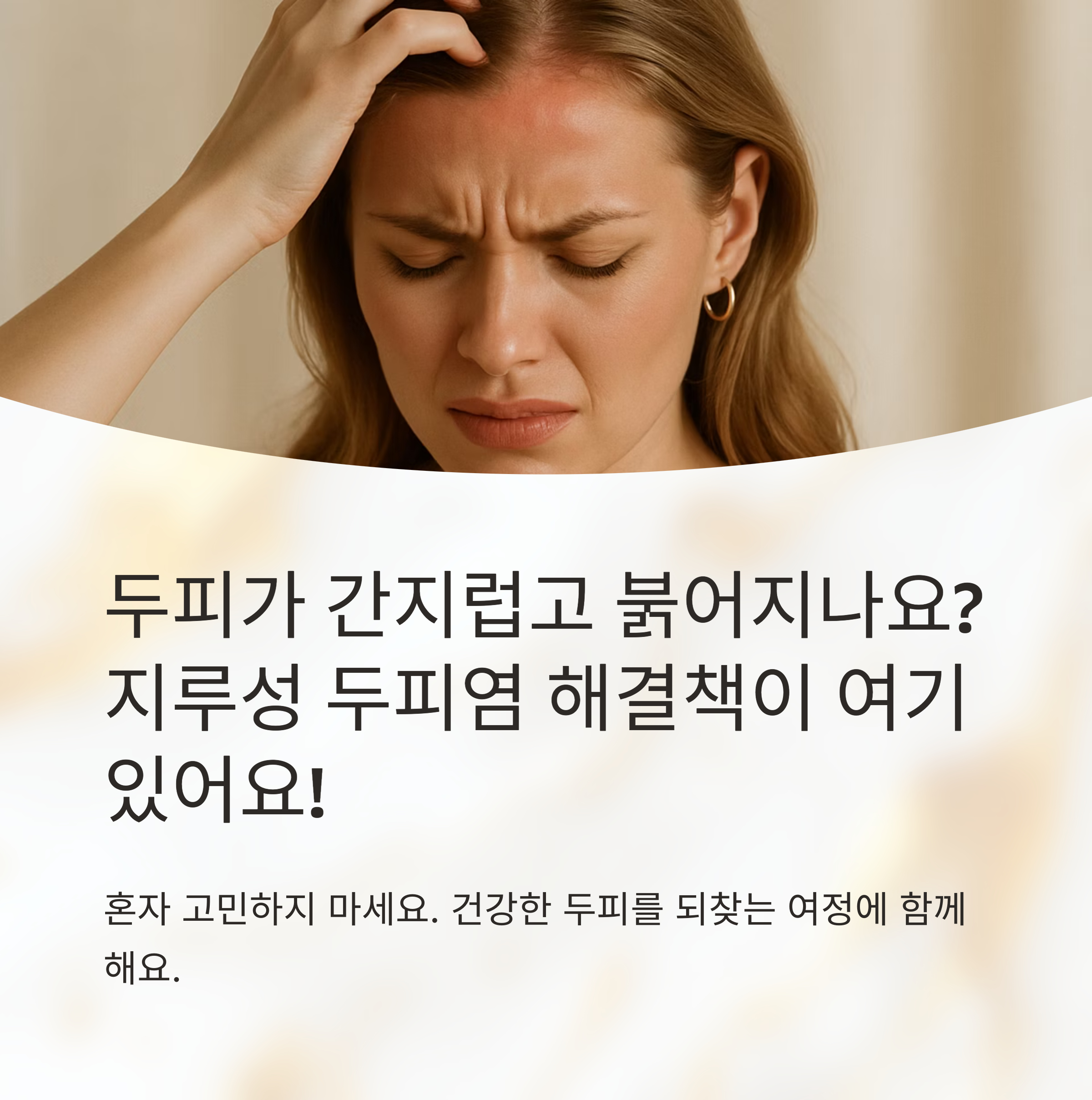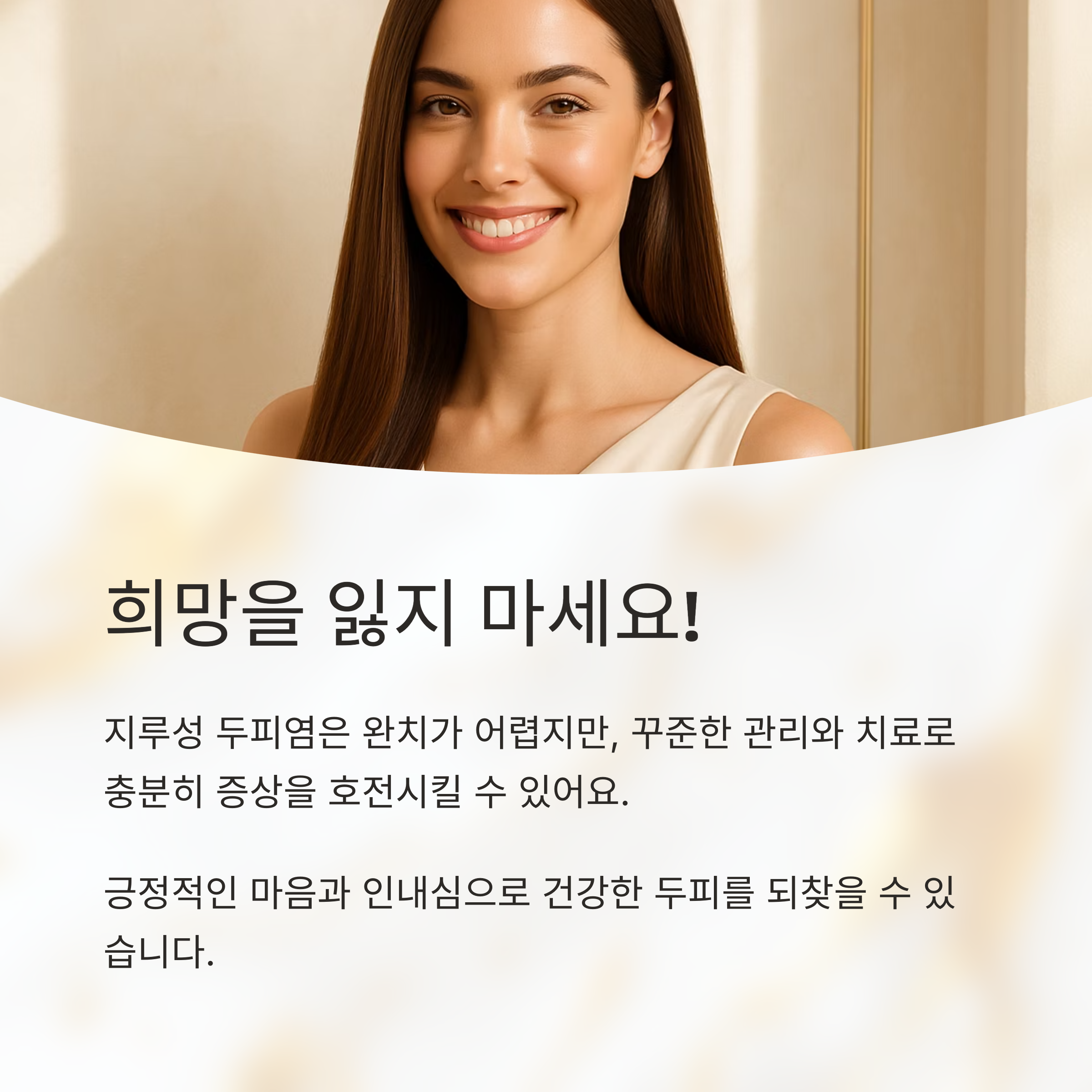 지루성 두피염은 완치가 어렵고 재발 가능성이 높은 질환이지만, 절대 포기해서는 안 됩니다. 꾸준한 관리와 치료를 통해 충분히 증상을 호전시키고, 건강한 두피를 유지할 수 있어요.