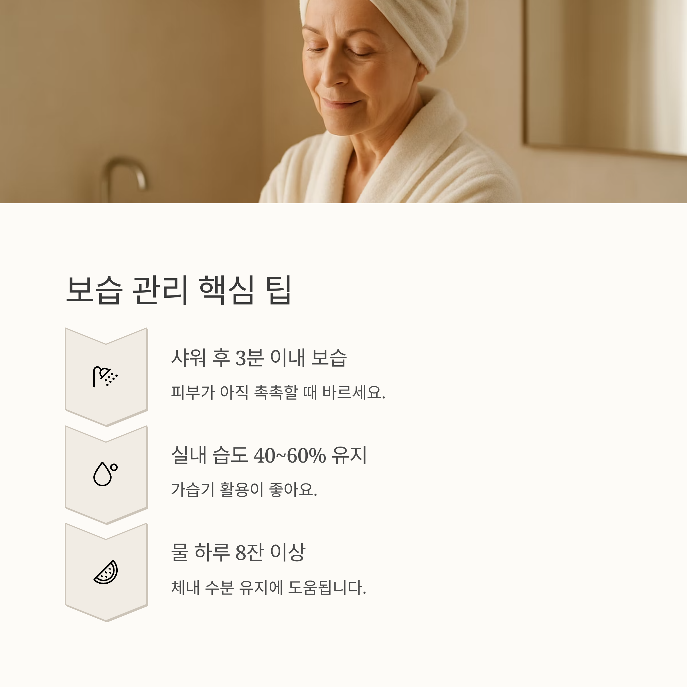 어떻게 보습 관리를 할까요? 세라마이드, 히알루론산, 글리세린 성분이 들어있는 보습제를 샤워 후 3분 이내에 발라주세요. 건조하면 수시로 덧발라도 좋아요. 저는 핸드크림을 항상 가지고 다니면서 핸드크림을 수시로 발라요. 평소 쓰는 화장품에 보습 오일을 몇 방울 섞어 바르는 것도 좋아요.