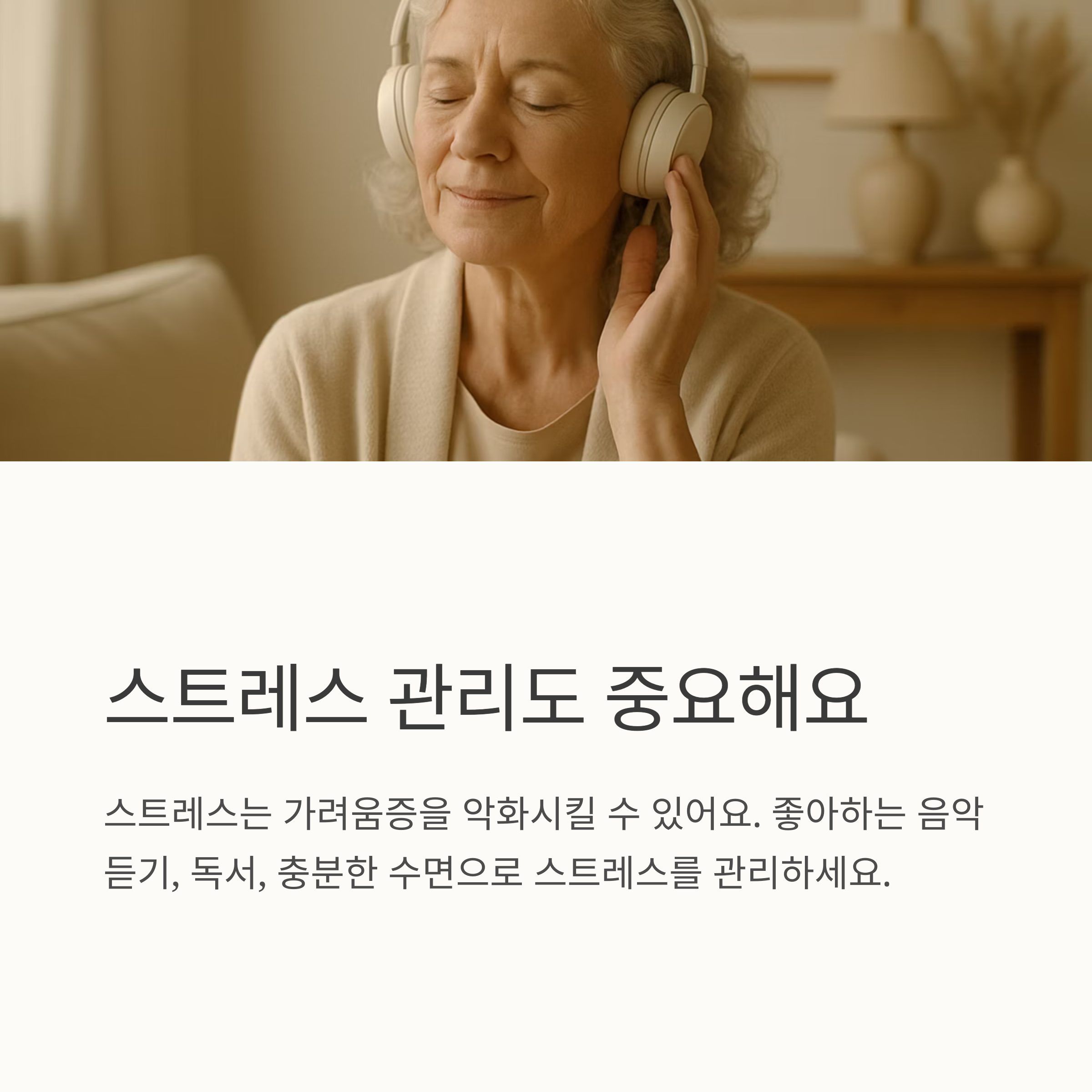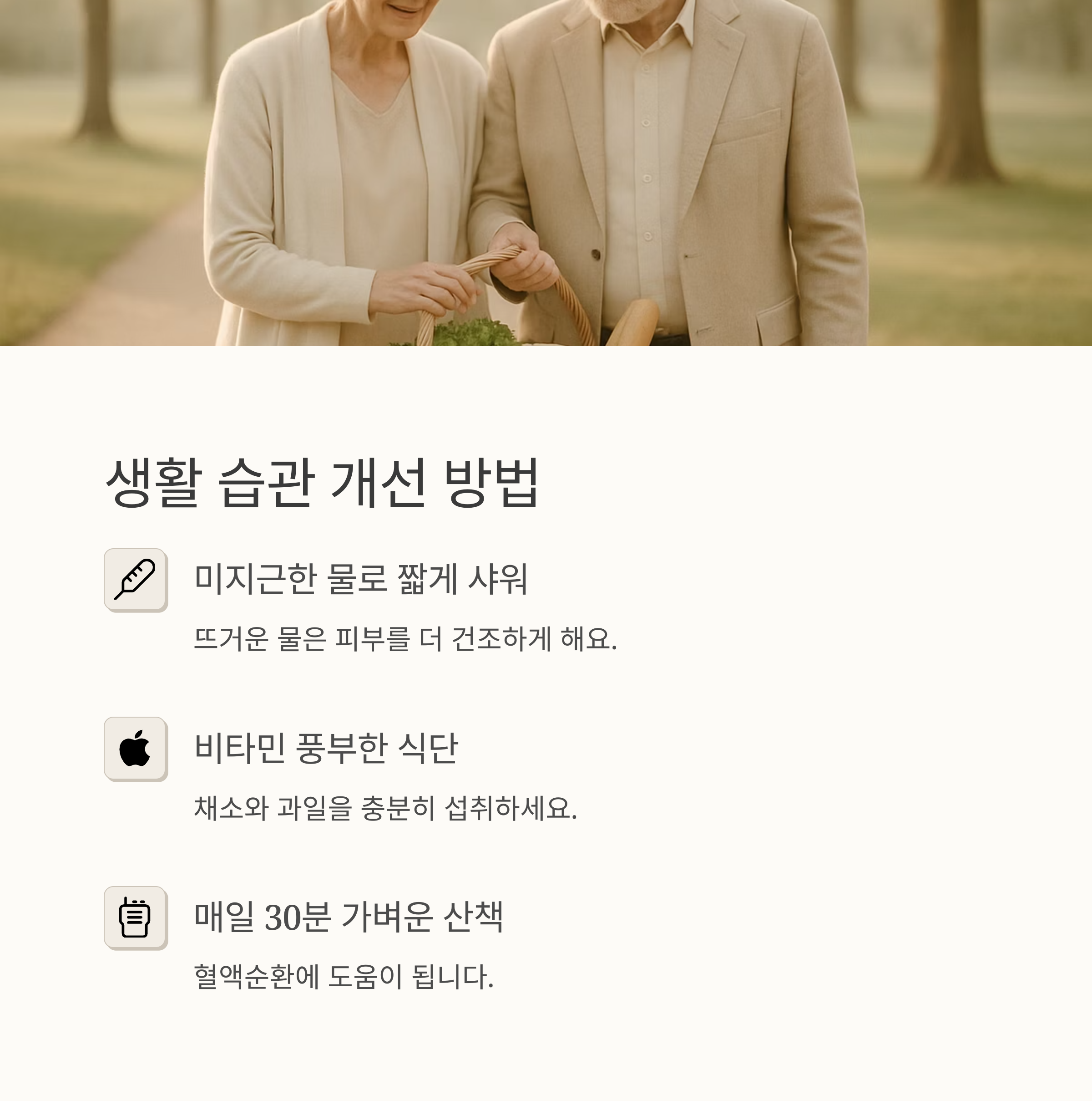 매일 30분 정도 가볍게 산책도 하고, 스트레스 해소를 위해 좋아하는 음악을 듣거나 책을 읽어요. 잠도 7~8시간 충분히 자려고 노력하고요. 면 소재의 옷을 입고, 자외선 차단제를 바르는 것도 잊지 않아요. 그리고 무엇보다 중요한 건 금연과 절주! 작은 변화들이 모여 긍정적인 결과를 가져왔어요.