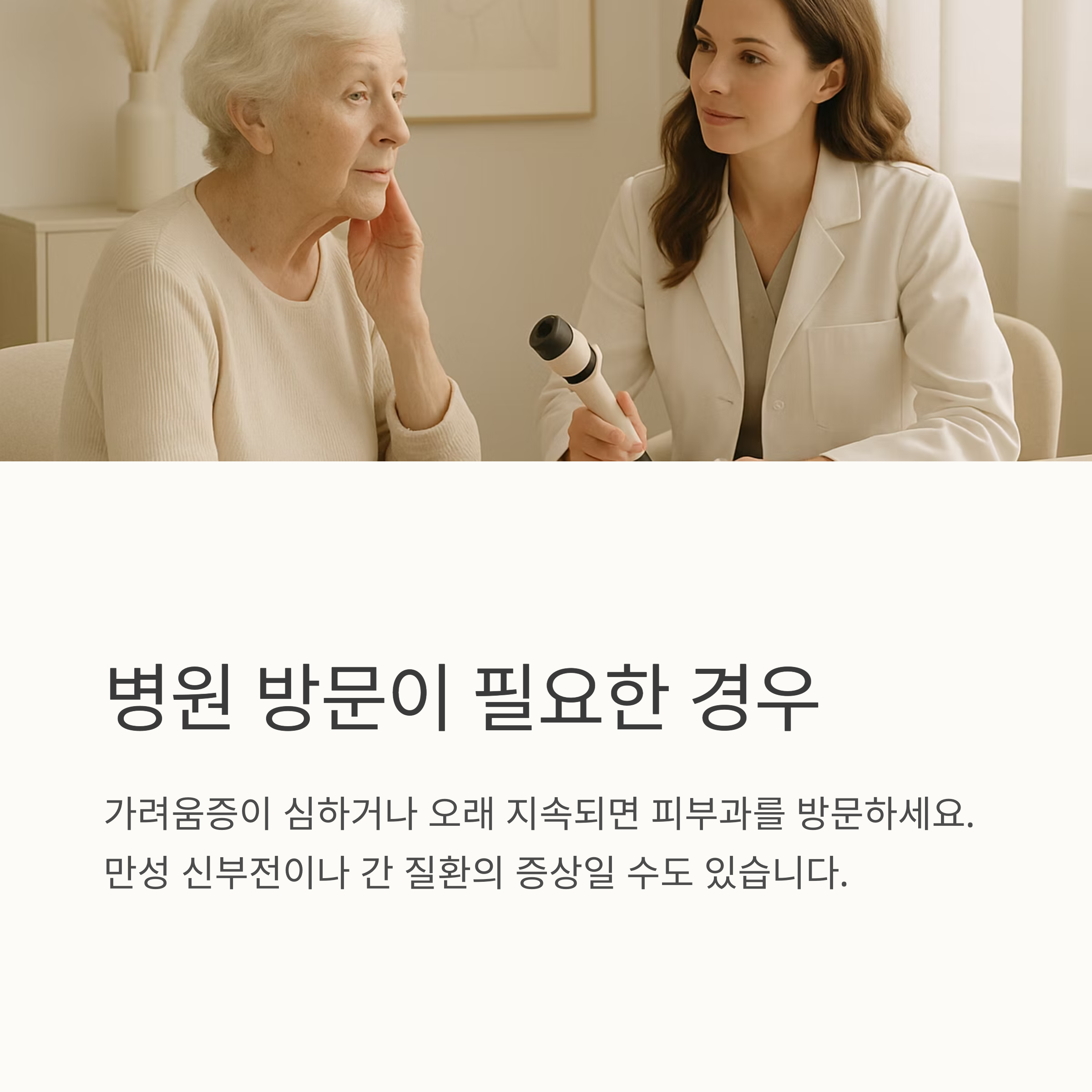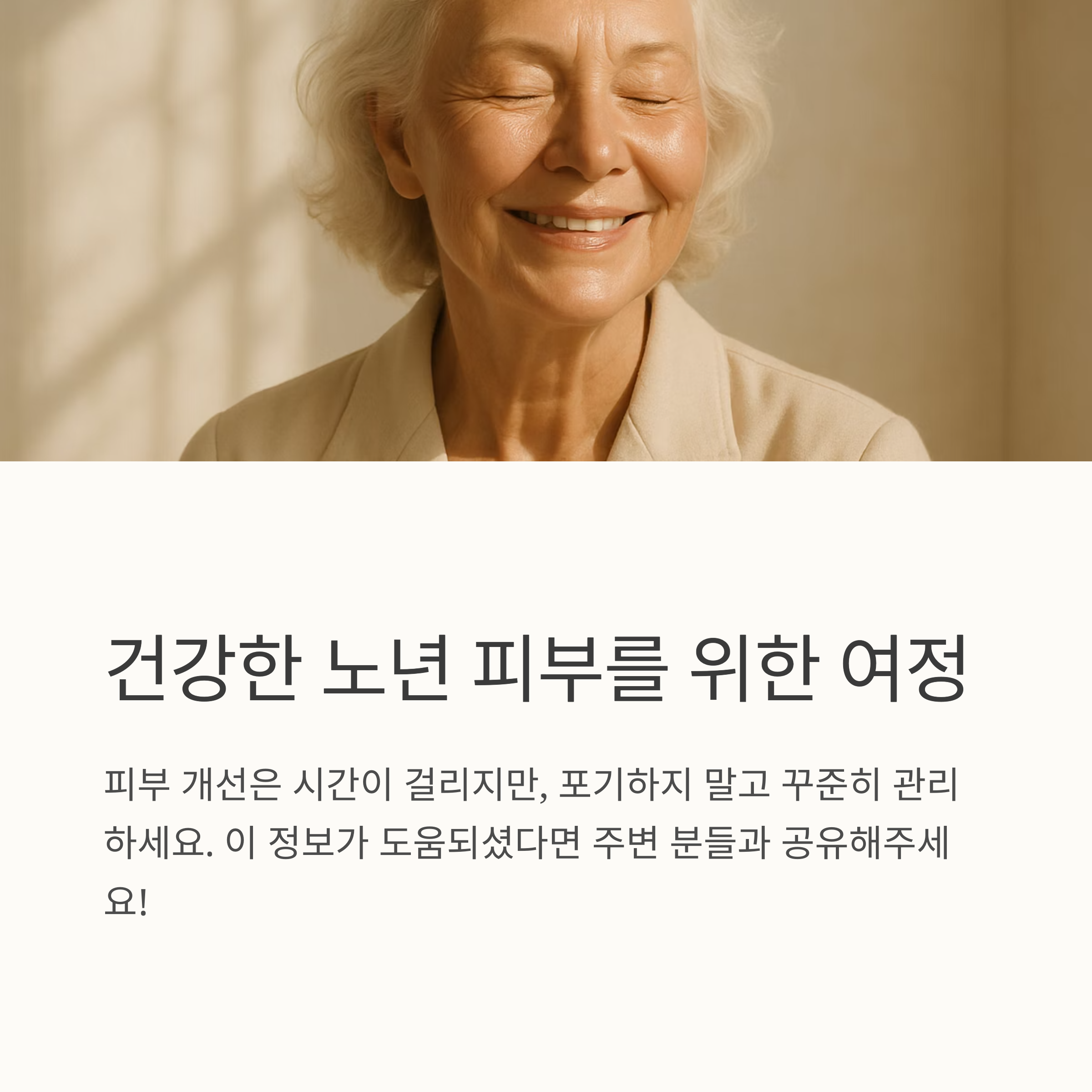 오늘 이야기 나눈 노인 피부 가려움증이 여러분의 건조하고 가려운 피부를 진정시키는 데 조금이나마 도움이 되었으면 좋겠어요. 피부 개선은 시간이 걸리지만, 포기하지 않고 꾸준히 관리하면 건강하고 편안한 피부를 되찾을 수 있을 거예요. 건강한 노년을 위한 여정을 함께 응원하겠습니다.