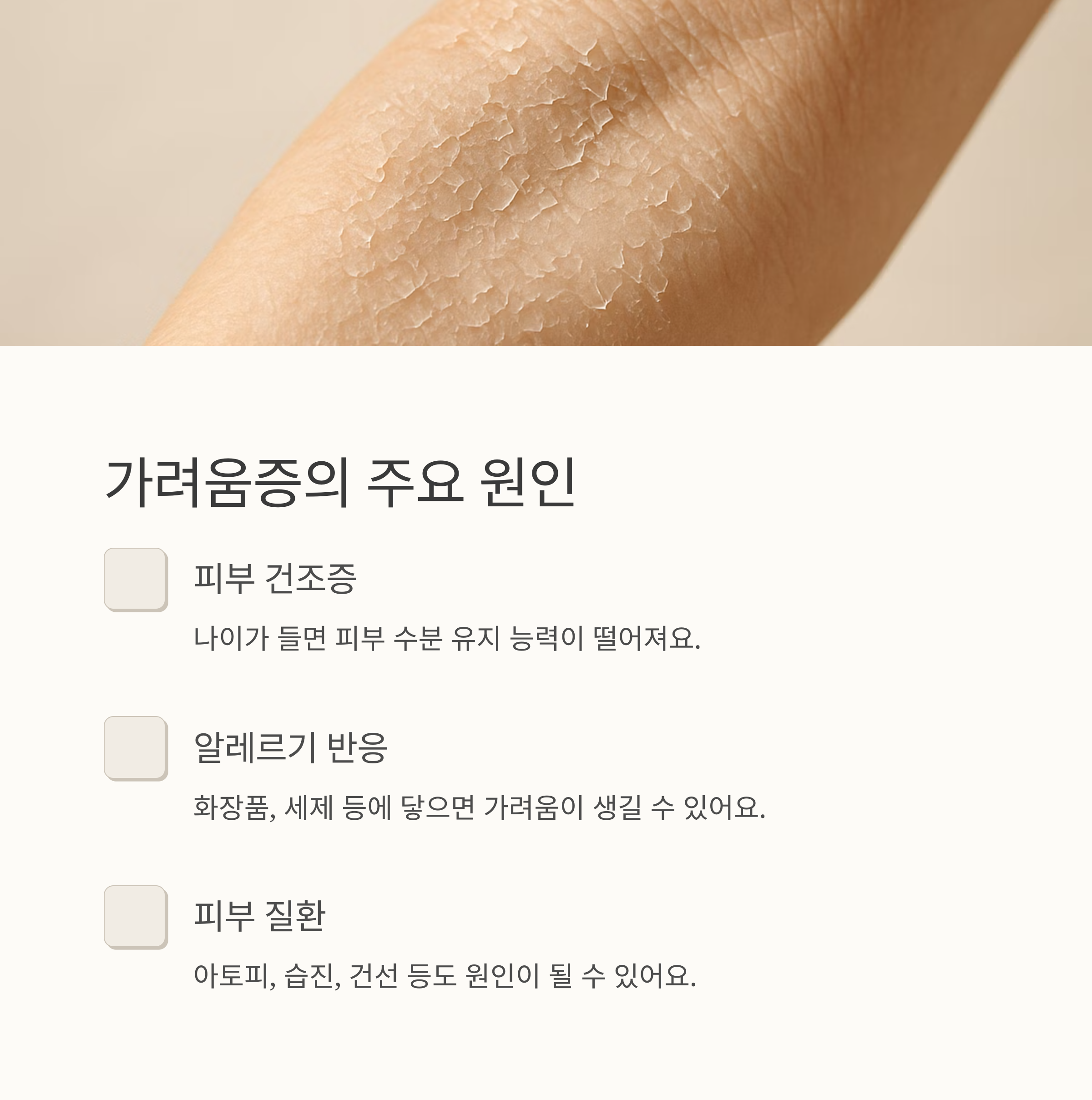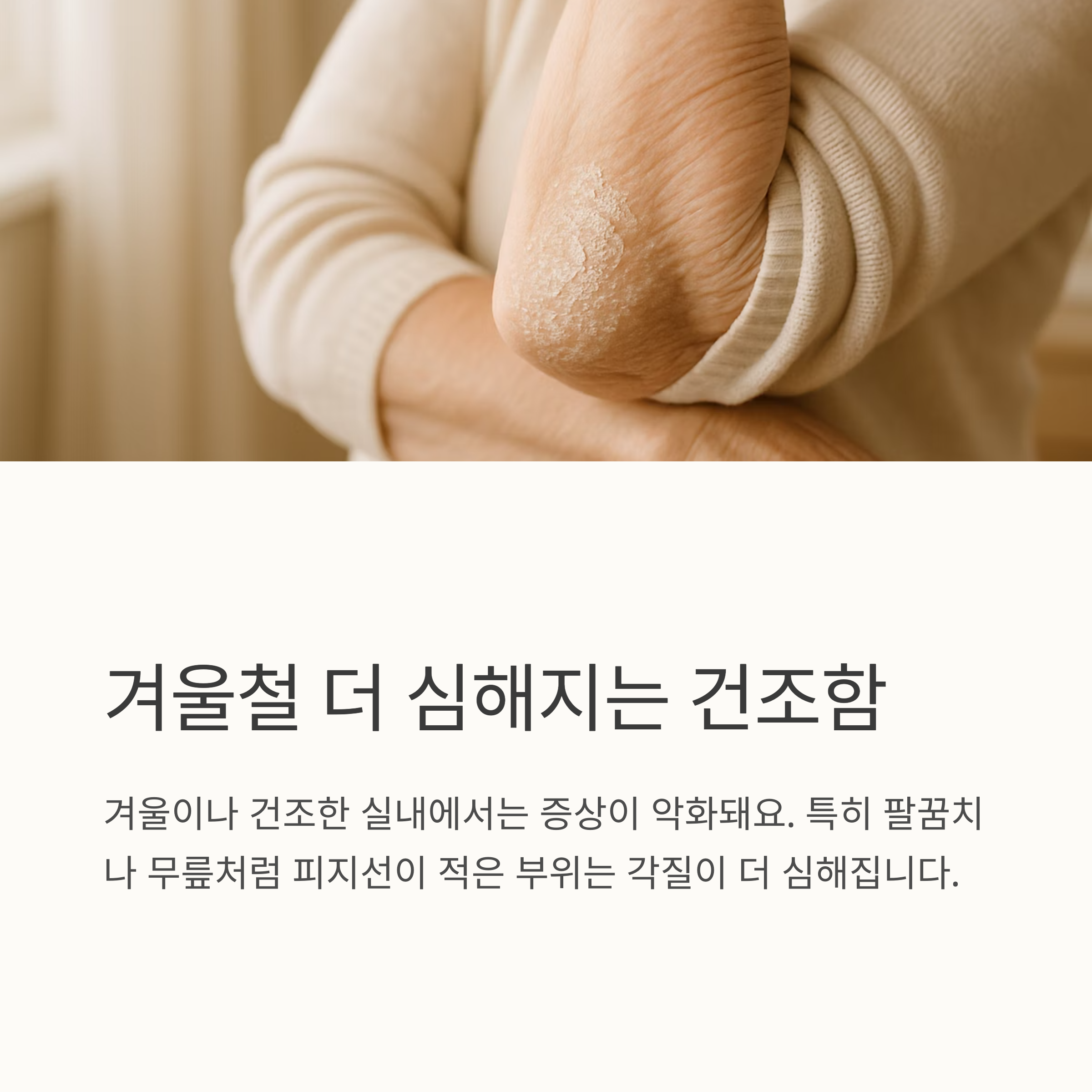 가려움에 밤잠 설치는 일은 누구나 겪을 수 있는 고민이죠. 가려움증 원인은 정말 다양해요. 가장 흔한 건 건조한 피부, 피부 건조증이에요. 나이 들면 피부 수분 유지 능력이 떨어지면서 더 심해지죠. 겨울철이나 건조한 실내에선 더욱 심해지고, 팔꿈치나 무릎처럼 피지선이 적은 곳은 특히 각질이 심해져요. 저도 겨울만 되면 팔꿈치가 하얗게 일어나서 걱정이에요.