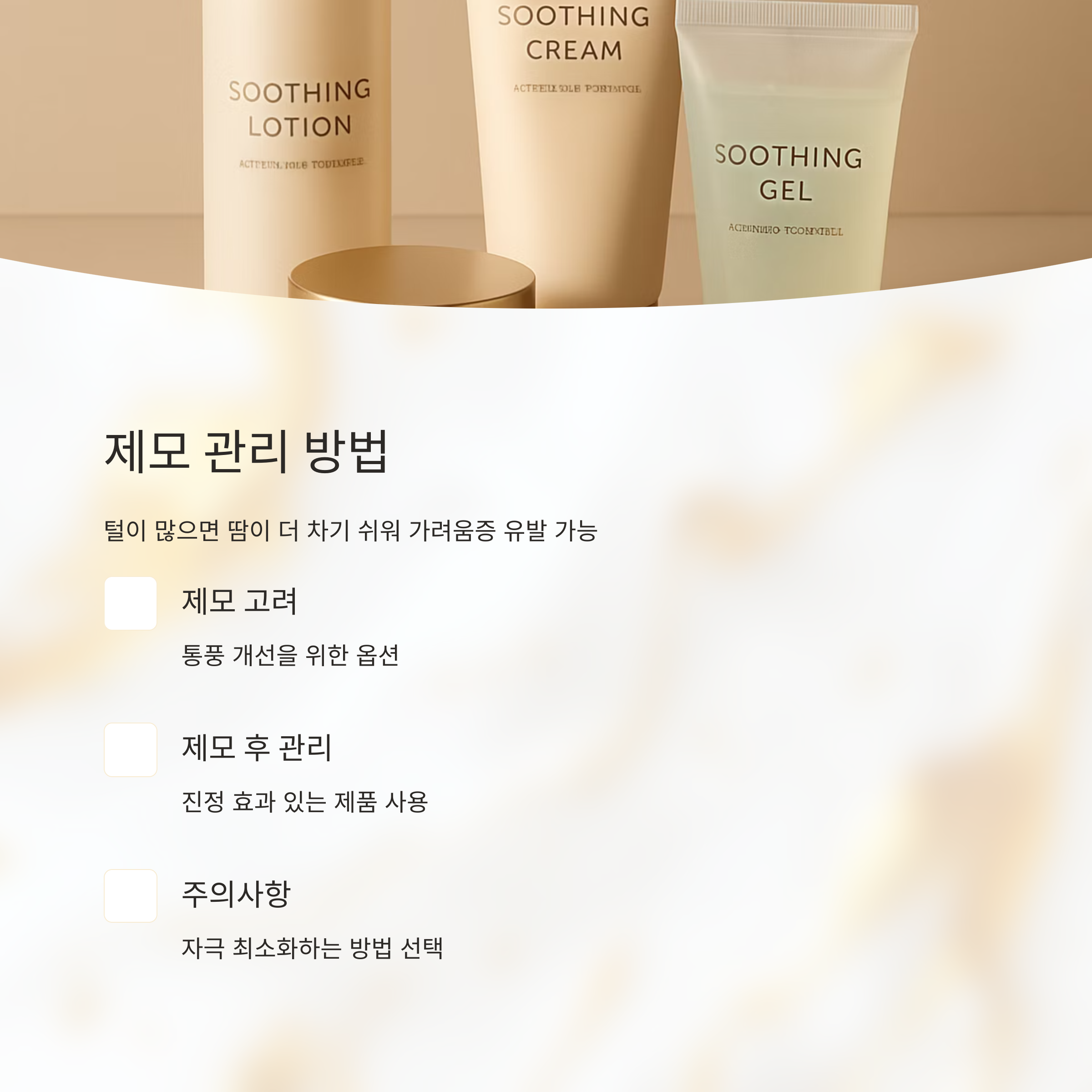 만약 털이 많아서 땀이 더 잘 차는 경우에는 제모를 고려해 볼 수도 있어요. 하지만 제모 후에는 피부가 자극받을 수 있으니, 진정 효과가 있는 제품을 사용하는 것이 좋답니다.