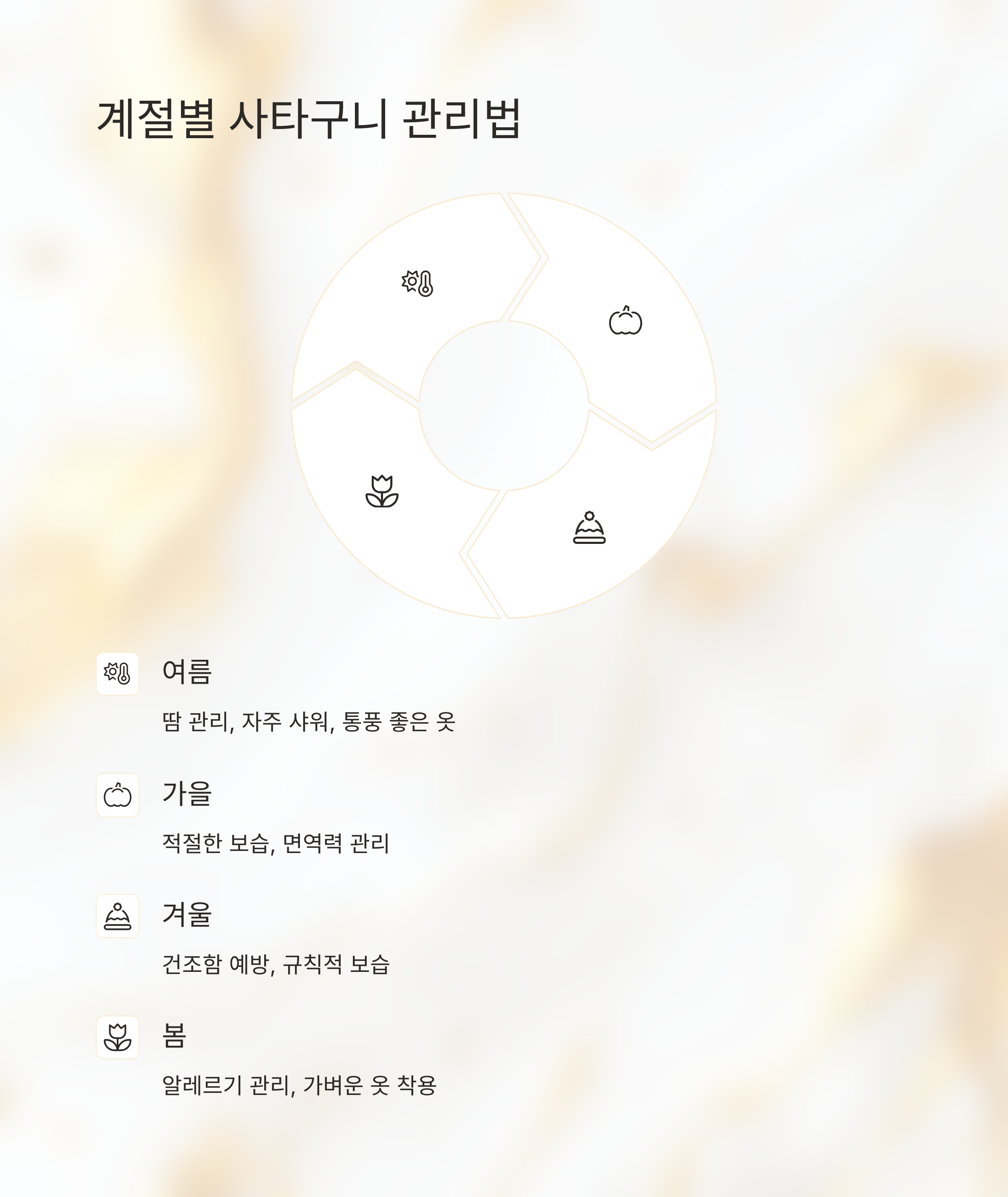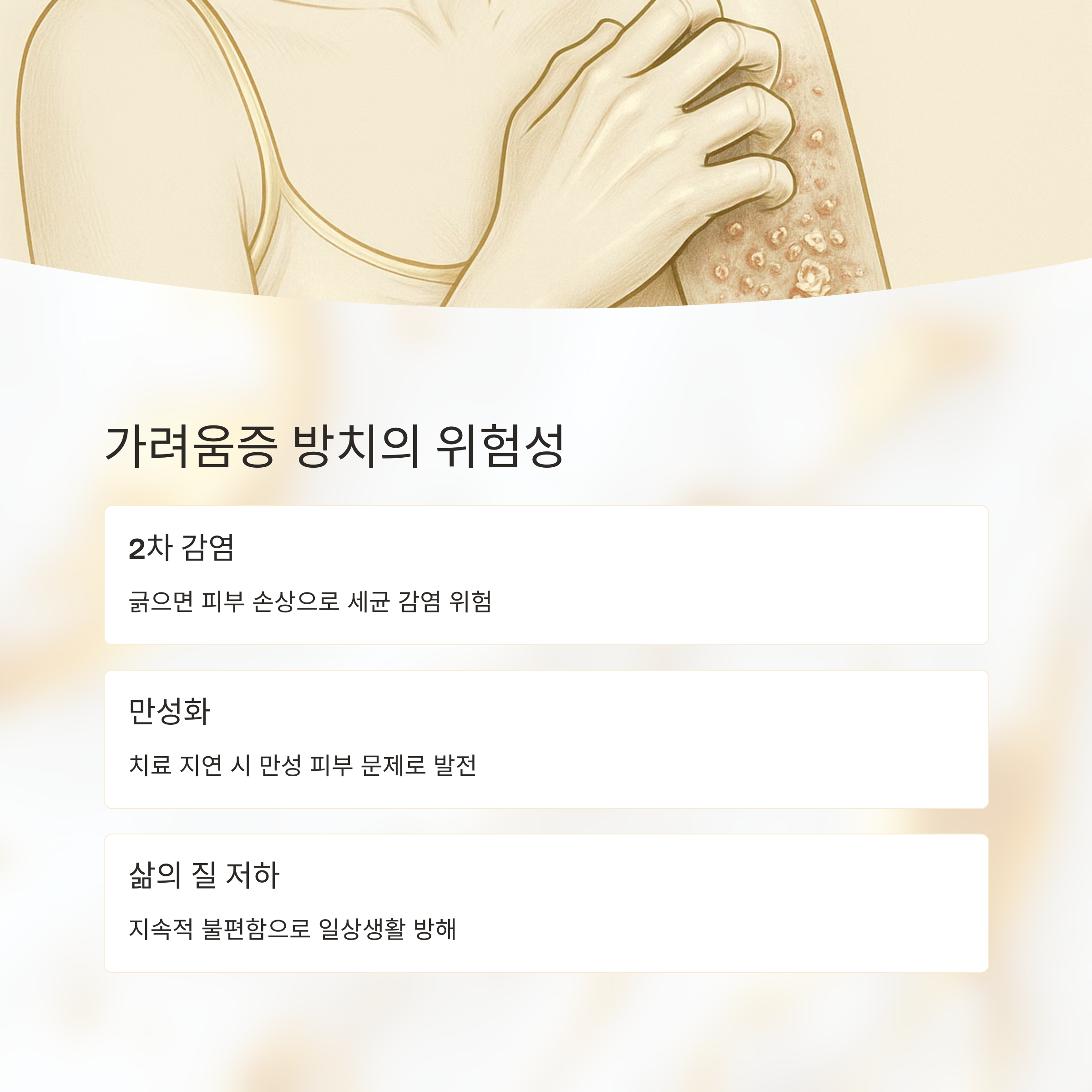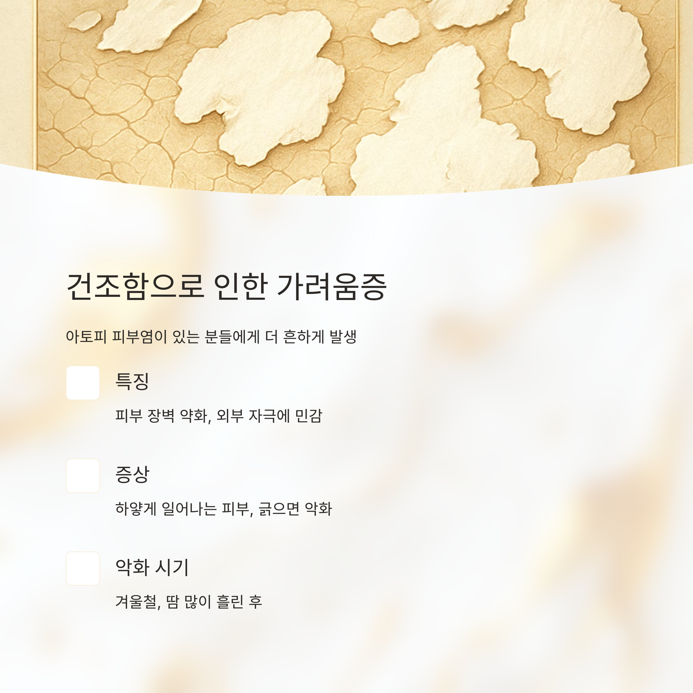 건조함 때문에 가려움증이 생길 수도 있어요. 특히 아토피 피부염이 있으신 분들은 피부 장벽이 약해서 외부 자극에 더 민감하고 건조해지기 쉽거든요. 피부가 하얗게 일어나고 긁으면 더 심해지죠. 겨울철이나 땀을 많이 흘린 후에 더 심해지는 경향이 있어요.