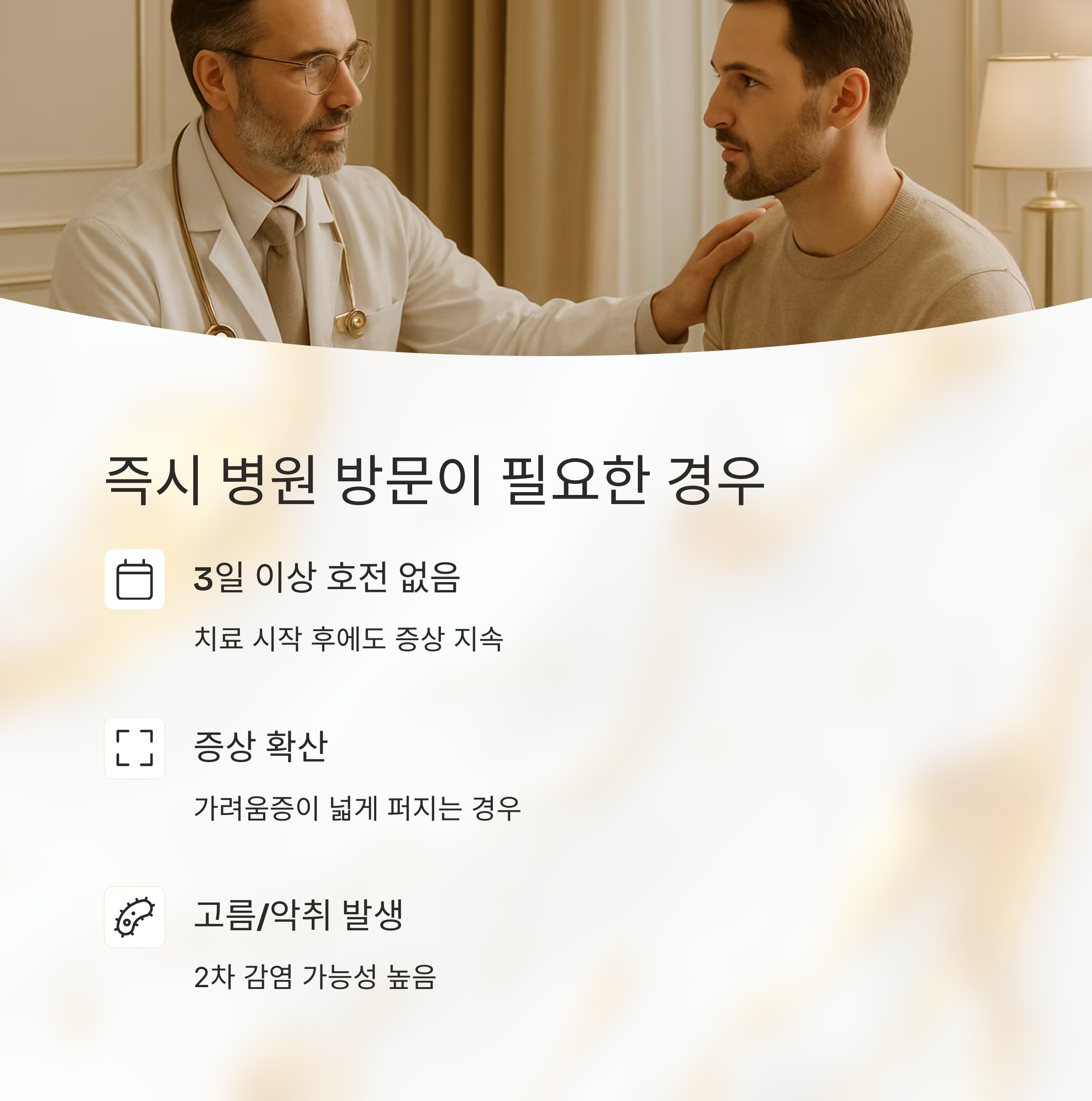 만약 치료를 시작했는데도 3일 이상 증상이 호전되지 않거나, 가려움증이 넓게 퍼지거나, 고름이나 악취가 난다면 즉시 병원에 가셔야 해요. 단순한 피부 질환이 아닐 수도 있거든요.