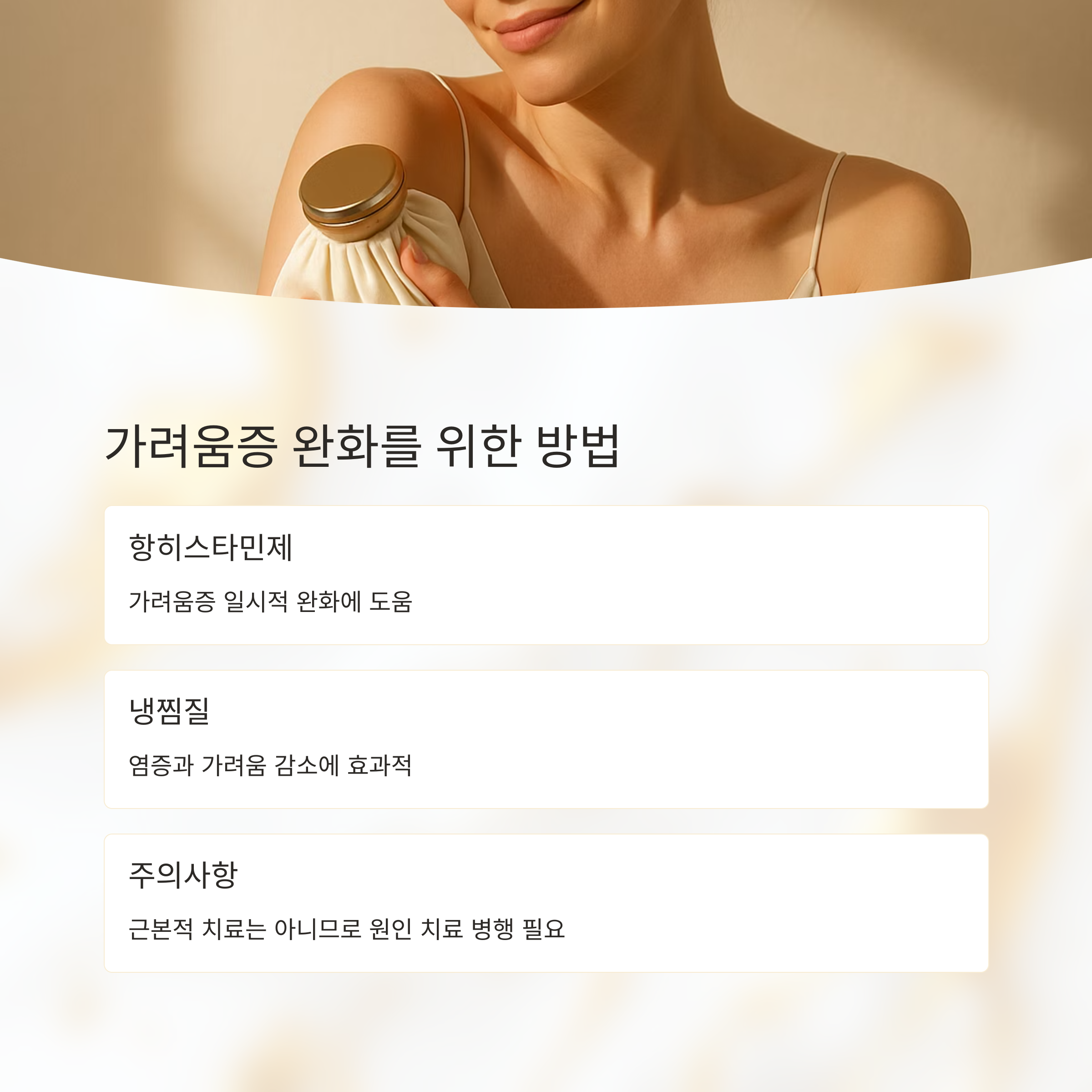 가려움증이 심할 때는 항히스타민제를 복용하는 것도 도움이 돼요. 하지만 이것도 일시적인 증상 완화 방법일 뿐, 근본적인 치료는 아니랍니다.