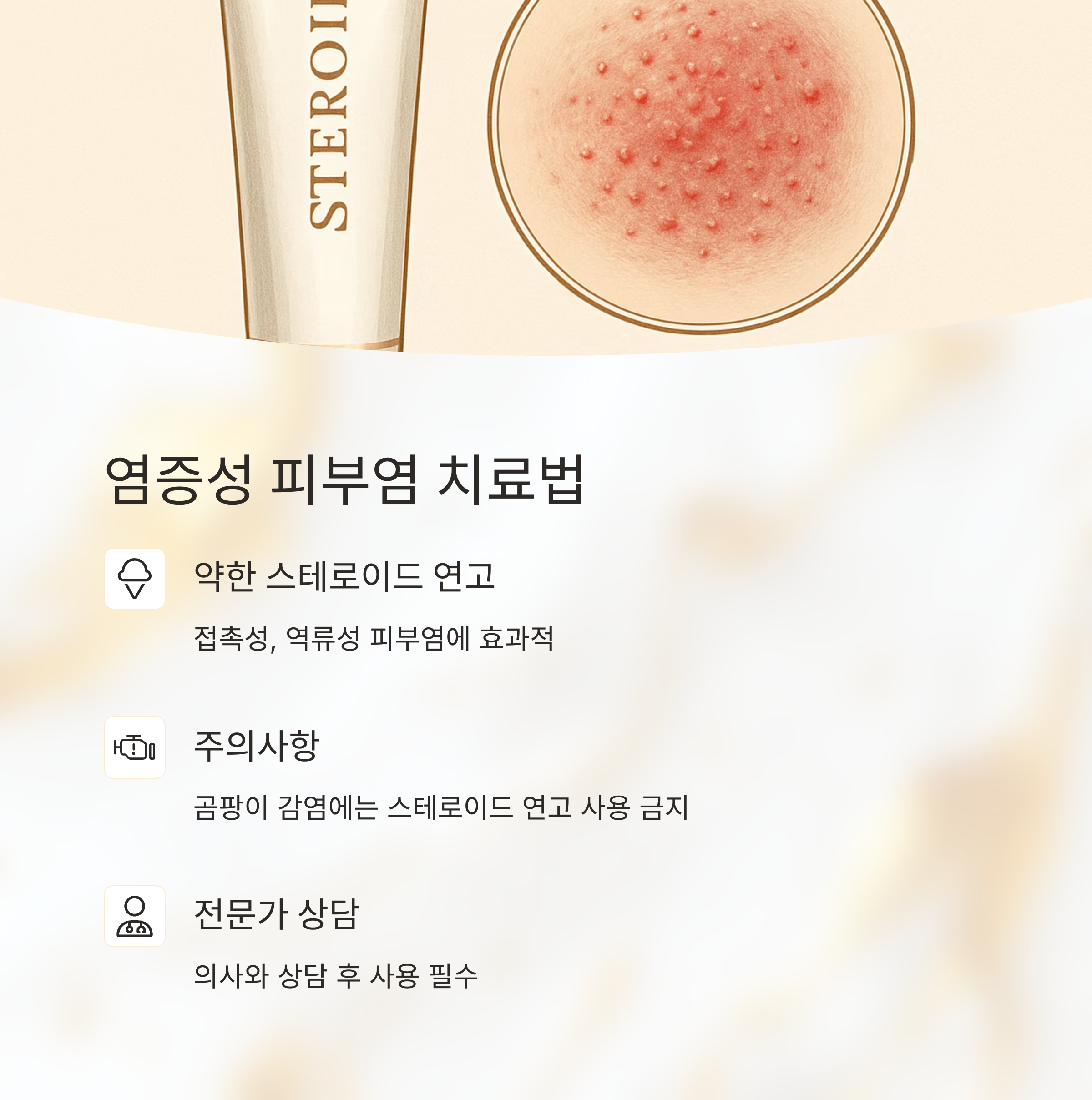 접촉성 피부염이나 역류성 피부염 같은 염증성 질환에는 약한 스테로이드 연고를 사용할 수 있어요. 하지만 곰팡이 감염에는 스테로이드 연고를 사용하면 안 돼요. 증상이 더 악화될 수 있으니까요! 꼭 의사와 상담 후에 사용해야 해요.