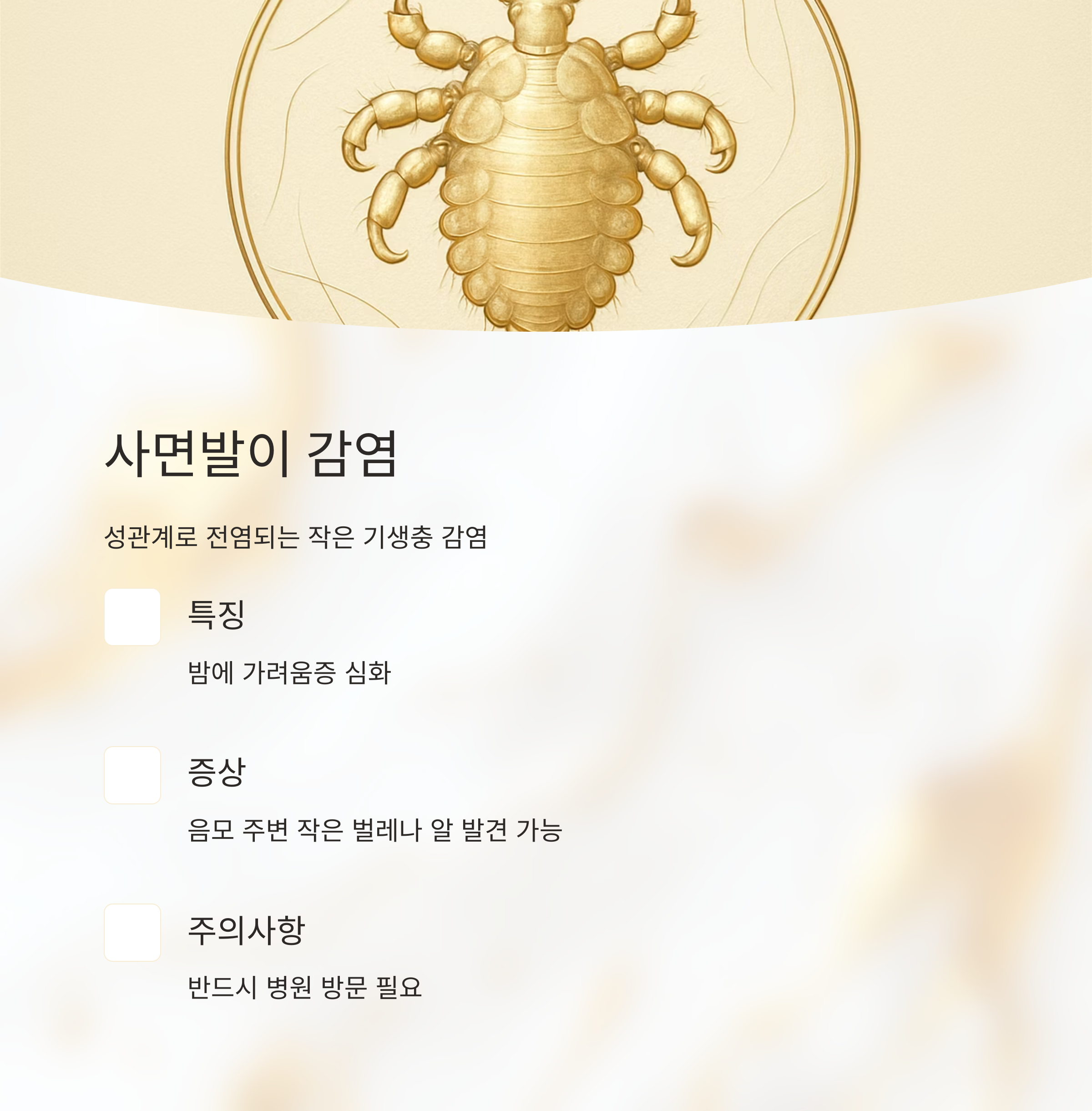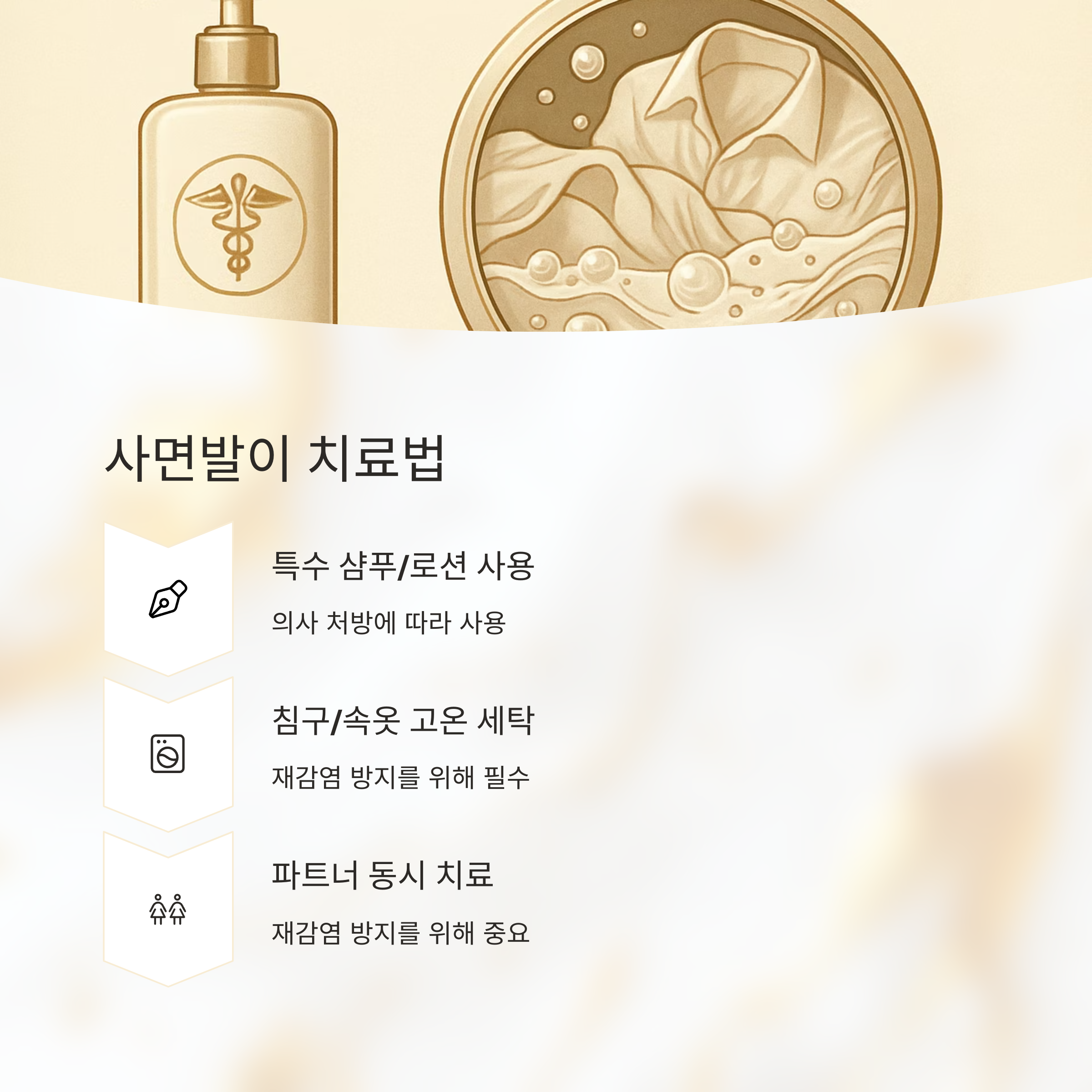 사면발이는 특수한 샴푸나 로션으로 제거해야 해요. 그리고 침구나 속옷은 고온으로 세탁하고 건조해야 다시 감염되는 것을 막을 수 있어요. 만약 파트너가 있다면 함께 치료받는 것이 중요하다는 점 잊지 마세요.