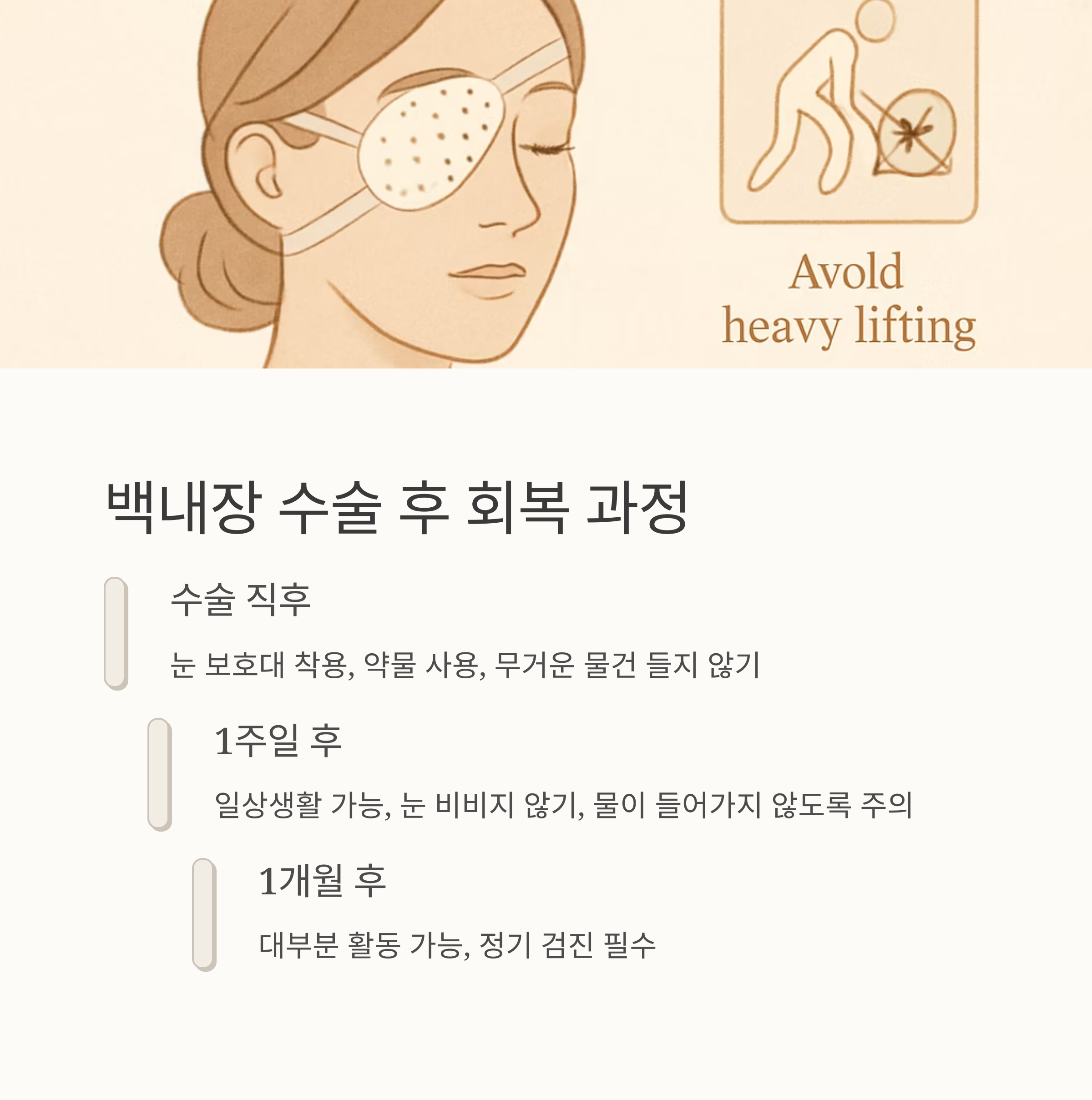 무조건 빨리 수술하는 것보다는 안과 전문의와 상담하여 적절한 시기에 수술하는 것이 중요해요. 마치 다른 질병들처럼 정확한 진단과 전문가의 판단에 따라 수술 여부를 결정해야 좋은 결과를 얻을 수 있다는 것을 잊지 마세요. 수술 후 관리도 매우 중요하니, 의사의 지시를 잘 따르는 것이 빠른 회복에 도움이 될 거예요.
