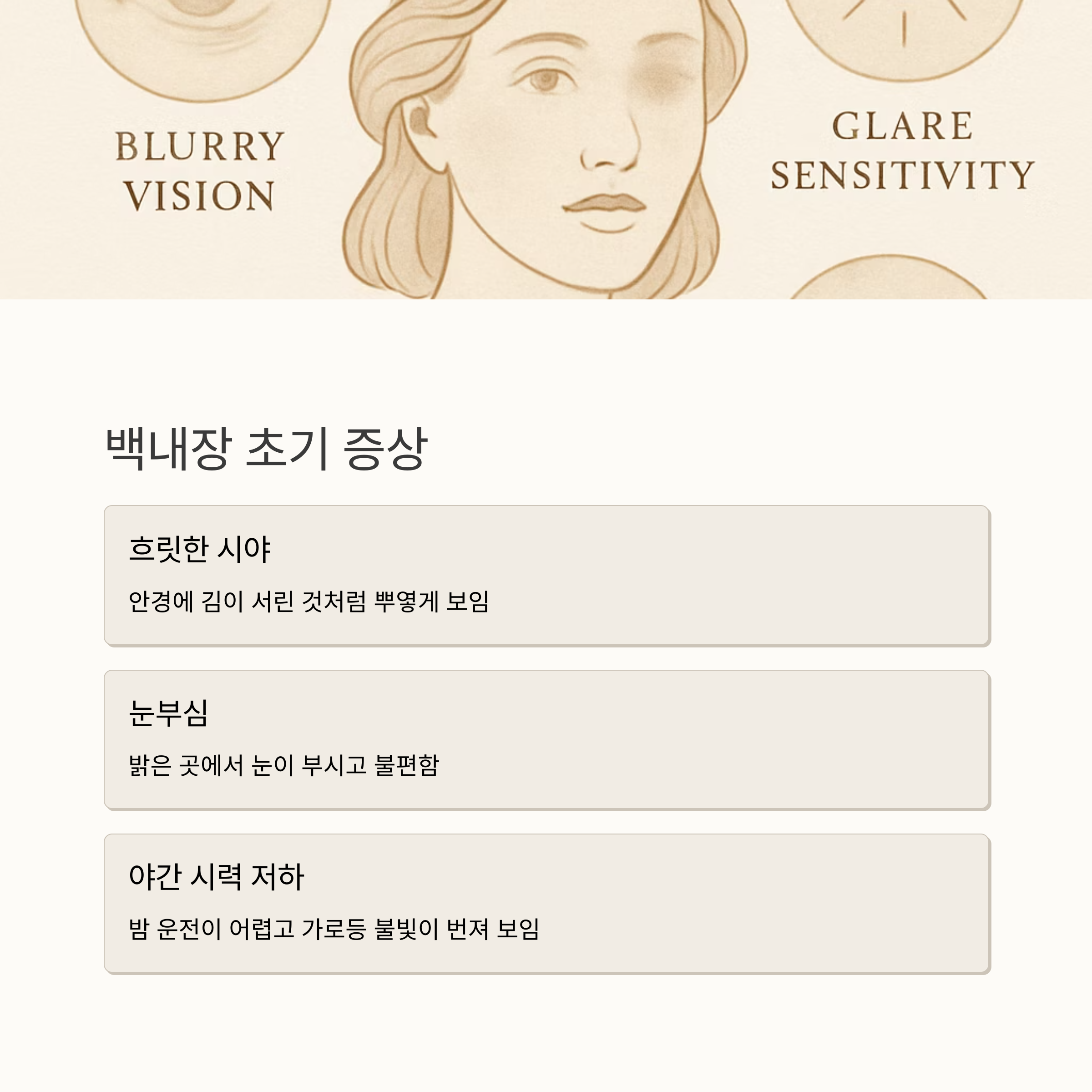 백내장은 처음에는 아무렇지도 않은 듯 넘어가기 쉬워요. 하지만 몇 가지 증상들을 잘 살펴보면 조기에 발견할 수 있답니다. 가장 흔한 증상은 바로 시야가 흐릿해지는 거예요. 마치 안경에 김이 서린 것처럼 뿌옇게 보이거나, 침침하게 느껴지죠. 또 밝은 곳에 있으면 눈이 부시고, 밤에 운전하거나 어두운 곳에서 물건을 보기가 힘들어질 수 있어요.