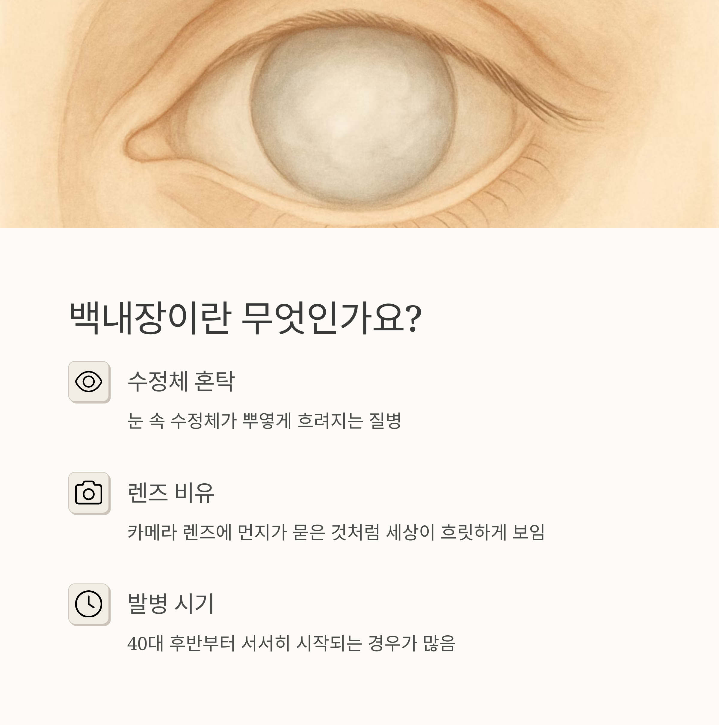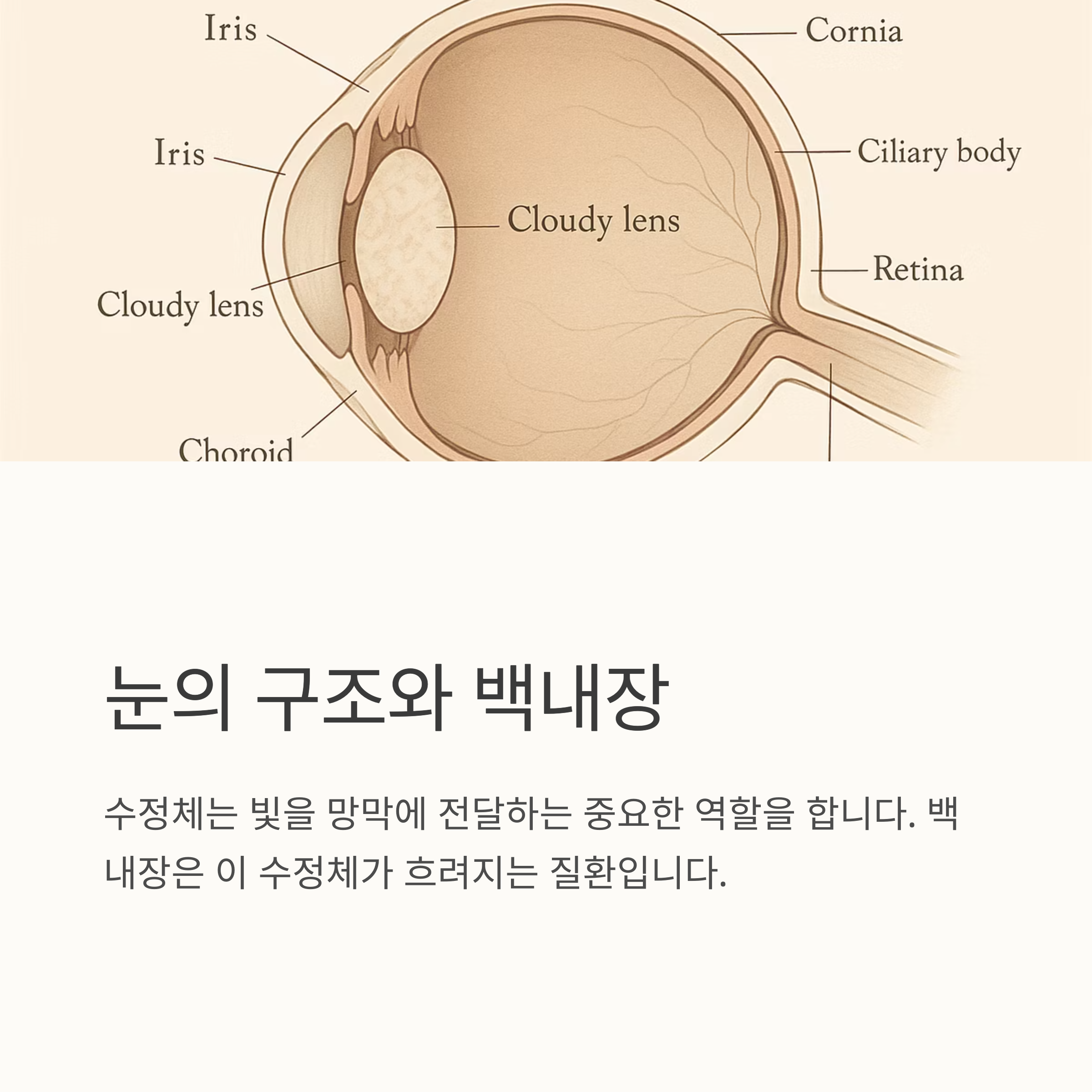 눈 건강에 대한 이야기를 시작하기 전에, 먼저 백내장이 무엇인지 알아야겠죠? 우리가 물체를 볼 수 있는 건 눈 속 수정체 덕분이에요. 이 수정체가 카메라 렌즈처럼 빛을 망막에 전달하는데, 백내장은 이 수정체가 뿌옇게 흐려지는 질병이랍니다. 나이가 들면서 자연스럽게 생길 수도 있고, 여러 가지 다른 원인 때문에 생길 수도 있어요.