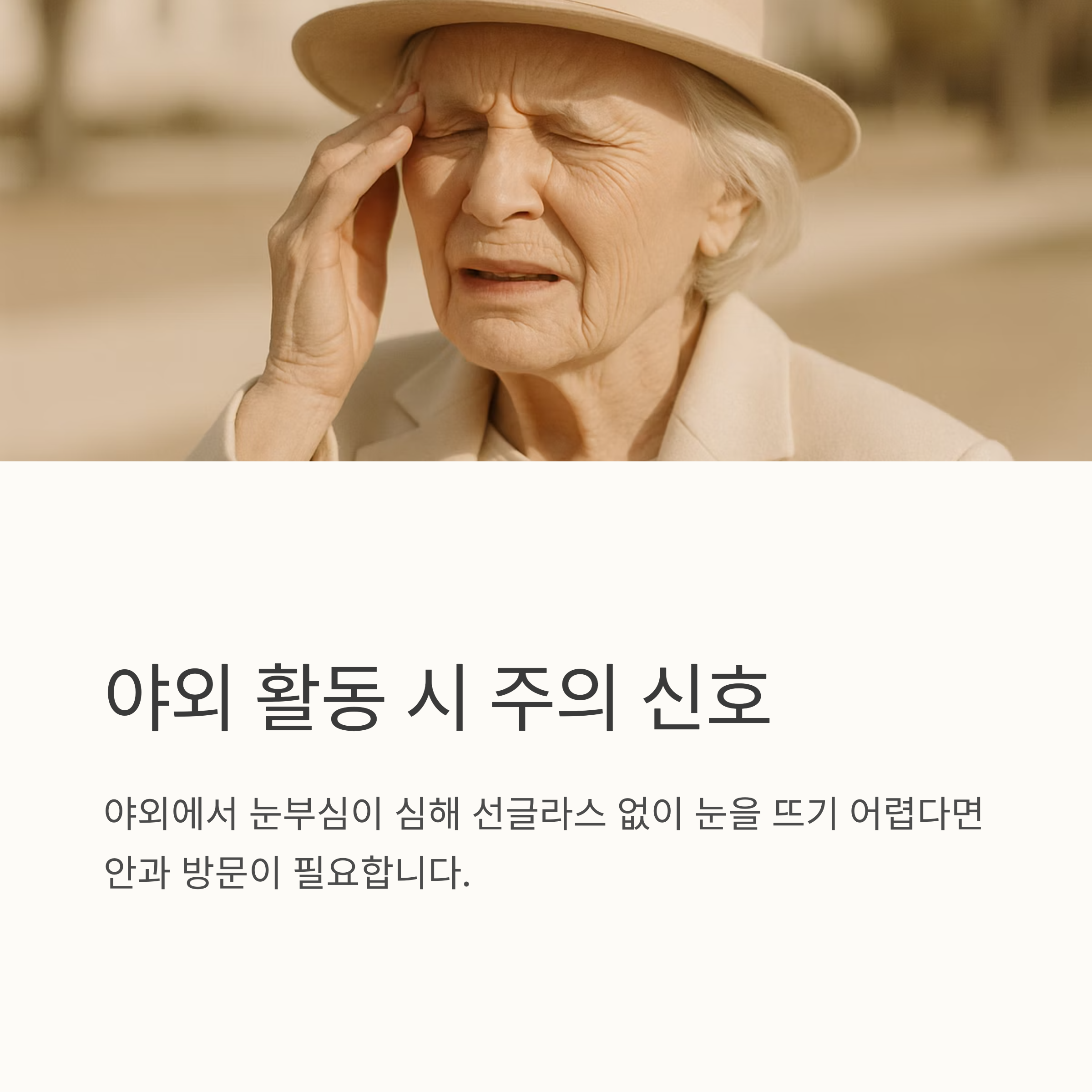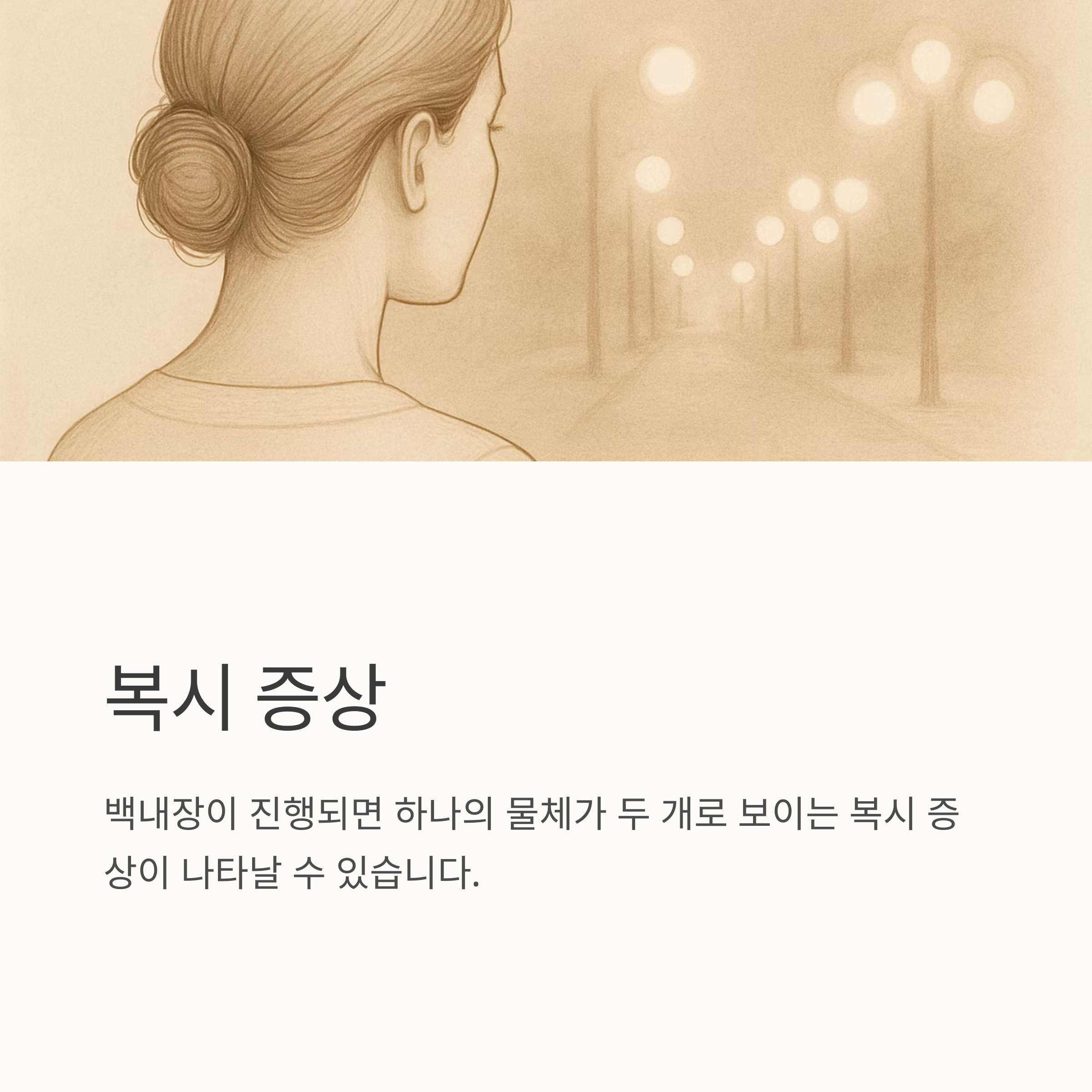 가로등 불빛이 번져 보이거나, 심지어는 두 개로 보이는 복시 증상까지 나타날 수 있대요. 특히 야외 활동을 할 때 눈부심이 심해져서 선글라스가 없으면 눈을 뜨기 어려울 정도가 되면 꼭 병원에 가봐야 합니다. 이런 증상이 조금씩 나타나기 시작한다면, 절대 방치하지 말고 안과에 가서 검진을 받아보세요. 빠른 진료가 좋은 결과를 가져다 줄 수 있으니까요. 내 눈 건강은 내가 지켜야 한다는 사실을 꼭 기억해주세요!
