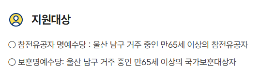 이 지원 사업의 대상은 울산 남구에 살고 있는 65세 이상의 국가보훈대상자분들이에요. 하지만, 몇 가지 법률에 따라 보훈대상자로 인정받으셔야 해요.